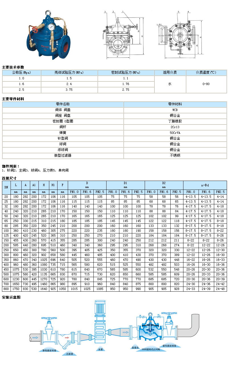 300X緩閉止回閥由主閥、單向閥、針閥、球閥、微形過(guò)濾器和壓力表組成水力控制接管系統(tǒng)。利用水力自動(dòng)操作,可使主閥得到佳的開(kāi)啟或關(guān)閉速度。防止水鍾水擊的產(chǎn)生,以達(dá)到緩閉消聲的效果。本產(chǎn)品利用水力自力控制,不需要其它裝置和能源,保養(yǎng)簡(jiǎn)便,開(kāi)啟及緩閉平穩(wěn)。本系列閥門(mén)產(chǎn)品廣泛用于高層建筑、生活區(qū)等供水管網(wǎng)系統(tǒng)及城市供水工程。當(dāng)閥門(mén)從進(jìn)口端給水時(shí),水通過(guò)微型過(guò)濾器、針閥、單向閥進(jìn)入主閥控制室,再經(jīng)過(guò)球閥排水至下游。因?yàn)獒橀y開(kāi)度小于球閥開(kāi)度,即主閥控制室的排水速度大于進(jìn)水速度,因此控制室壓力降低,作用于主閥盤(pán)下端的進(jìn)口壓力打開(kāi)主閥向下游供水。當(dāng)管道停止供水時(shí),若下游水開(kāi)始回流,一部分回流水經(jīng)球閥進(jìn)入主控制室,由于單向閥作用,回流水不能從主控制室流出,引起主控制室逐漸升壓,緩緩關(guān)閉主閥。 |